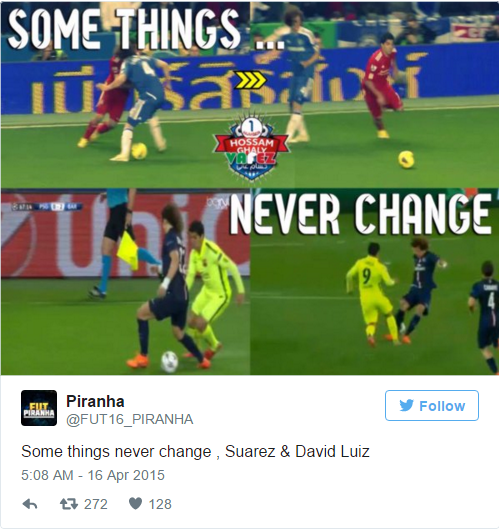 Luis Suarez nutmegs David Luiz twice in the Champions League in Paris as Barcelona win away leg 3-1. April 2015.